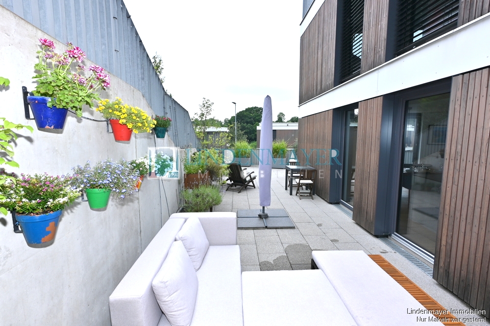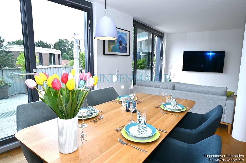 Hier öffnet sich der Raum zu Ihrer 87 m² großen Terrasse, die mit einer beeindruckenden Aussicht auf die Umgebung lockt. Stellen Sie sich vor, hier bei Sonnenuntergang zu entspannen oder Gäste zu einem gemütlichen Dinner im Freien einzuladen. Hochwertige 3-Fach-Holzfenster lassen viel Tageslicht herein und bieten einen tollen Blick.
