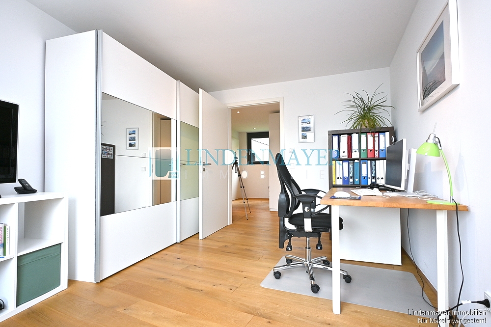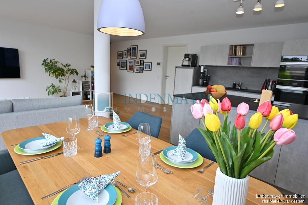 Der durchdachte Grundriss ermöglicht flexible Gestaltungsmöglichkeiten – ob gemütliche Sitzgruppen, ein großer Esstisch oder kreative Bereiche. Das edle Echtholzparkett in gebürsteter Eiche unterstreicht die elegante Atmosphäre und sorgt für ein angenehmes Raumgefühl.